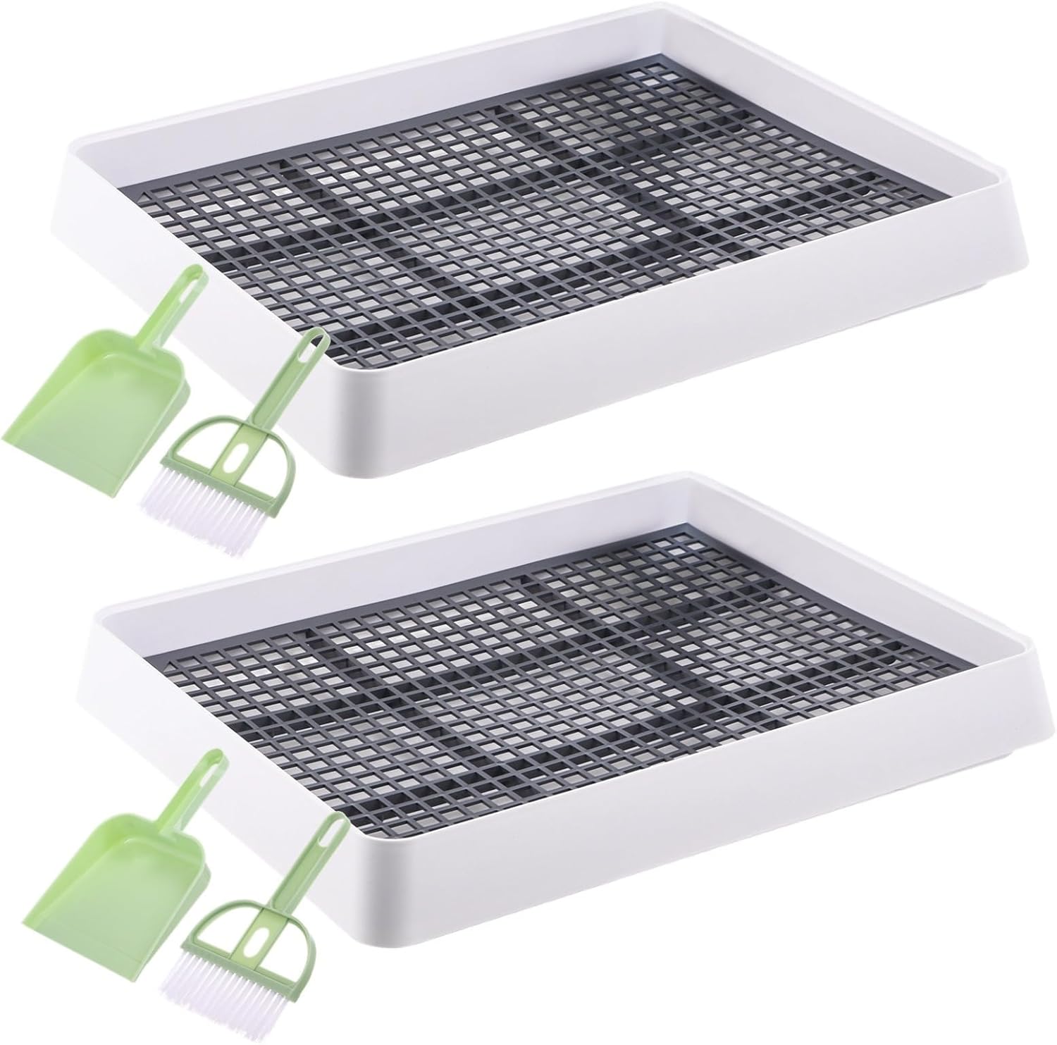 Color: white Material: PP Size: 15.1 times;12.2 times;2.6in Package Includes: 2 times;pet potty tray Note: - Please refer to the measurement. Tiny measuring error is allowable in normal range. - There might be a little color difference due to the monitor, camera or other factors, please refer to the physical item.