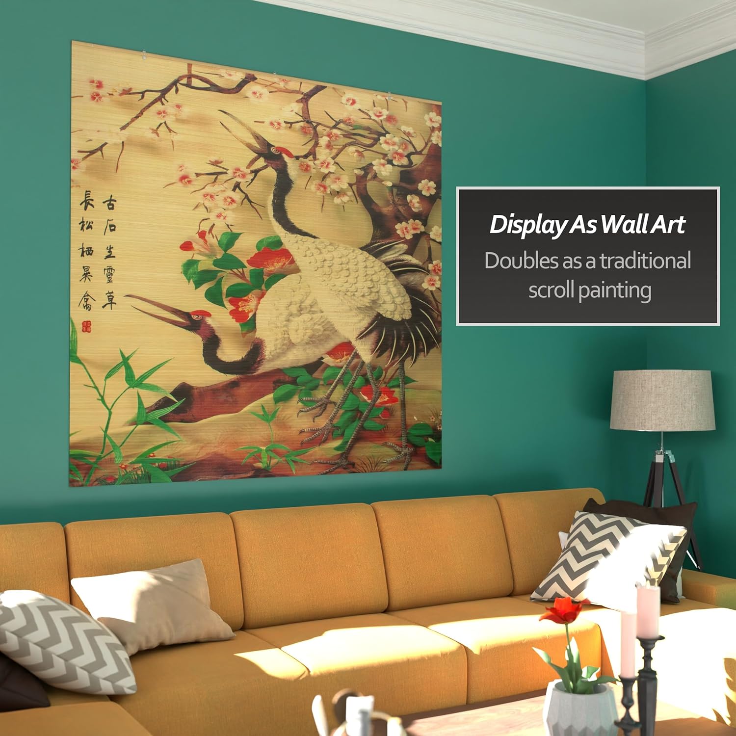 Transform your window into an art display with our 72" long printed artwork bamboo blinds. Featuring a print of two cranes beneath cherry blossoms it is a symbol of long life and wisdom and a reminder to find a moment of peace during a busy day. Printed on sturdy bamboo, it has a modern, safe cordless design and can be adjusted to different heights using hidden loops on the back for a neat and tidy appearance. With the ability to adjust to three different positions, you can effortlessly control the amount of light and privacy in your space. Whether it's for your living room, bedroom, or office, this window shade offers both practicality and elegance. Enjoy the soothing ambiance and customizable illumination this shade brings to your home.