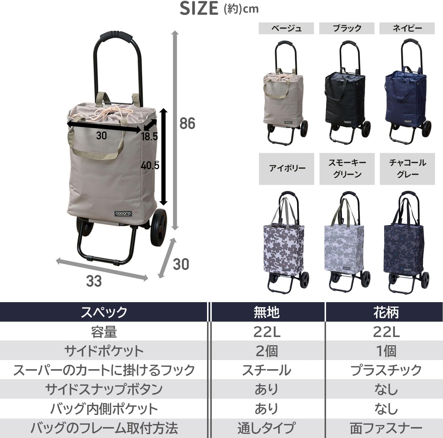 Bag Capacity: 5.7 gal (22 L); Load Capacity: 44.6 lbs (22 kg); Compact and spacious tote bag type cart; The bag is removable and can be used as a single item; The lining of the bag is made of aluminum and is heat retaining and cold; Frame can be folded compact; Comes with a hook for hanging on a super cart *Depending on the shape of the super cart