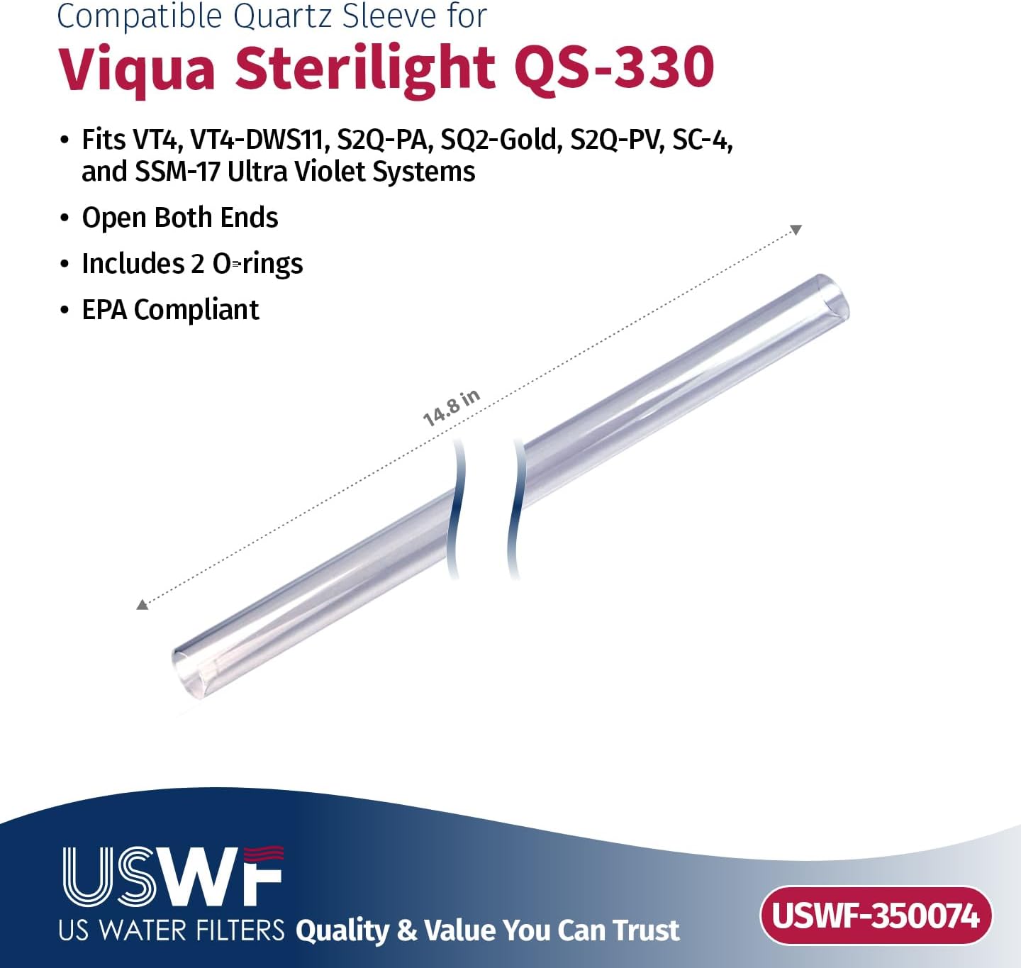 Looking for a value driven, alternative solution to your name brand "factory" replacement UV lamp and sleeve US Water Filters replacement lamps and sleeves are made in the US to the exact same stringent manufacturing protocols, and are backed by a one-year, no-hassle warranty. The USWF-142074 is a replacement for VIQUA S330-QL Lamp/Sleeve replacement combo pack used in the VIQUA VT4 and S2Q-PA systems and discontinued SSM-17 and SC4 systems. The UV lamp needs replacement every 12 months. After 9,000 hours the UV light weakens and isn't strong enough to properly treat your water. Replacing your lamp annually to ensure optimal system performance. The quartz sleeve is an important part of the UV water treatment system. It protects the UV lamp from coming in contact with the water while allowing the UV light to penetrate the water. Minerals from the water will build up on the sleeve over time causing the sleeve to become cloudy not allowing the UV light to penetrate the water as effectively. Once the mineral layer on the quartz sleeve cannot be removed via cleaning, or the sleeve cracks or breaks it's time to get a replacement. USWF-142074 includes the USWF-140142 lamp, USWF-350074 sleeve, and 2 o-rings to ensure you can replace the o-rings after every cleaning and lamp replacement. Safety Note: NEVER look directly at the UV lamp when it is powered on. Follow the instructions carefully to avoid injury to eyes and skin.