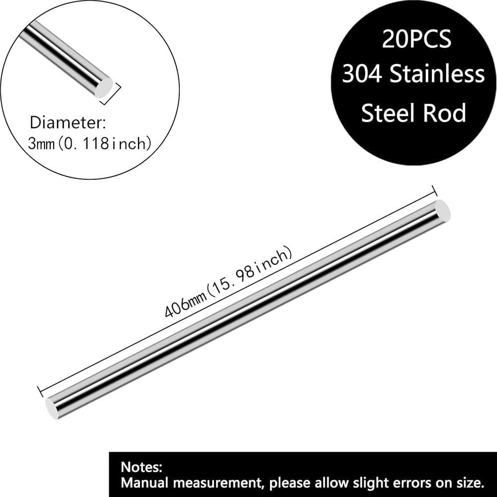 Features:*Precision Dimensions: Each stainless steel rod measures 406 mm in length and 3 mm in diameter, providing a perfect size for various industrial applications and DIY projects. *Material: Crafted from 304 stainless steel, these rods are resistant to rust, longevity and reliability in demanding environments. *Versatile Applications: For fabricating milling cutters, knives, and other tools, these rods serve a wide range of uses in metalworking, crafting, and repair tasks. *Customizable Length: The rods can be easily cut to your desired length, allowing for tailored solutions that meet specific project requirements. *Smooth Finish: With a crack-free and smooth , these rods are easy to shape and manipulate, enhancing your workflow and project outcomes.Specifications:*Product Name:Stainless steel rods*Material:Stainless steel*Size:As shown*Color:As shown*Number of Pieces:20 pcsPackage Content:20*stainless steel rods