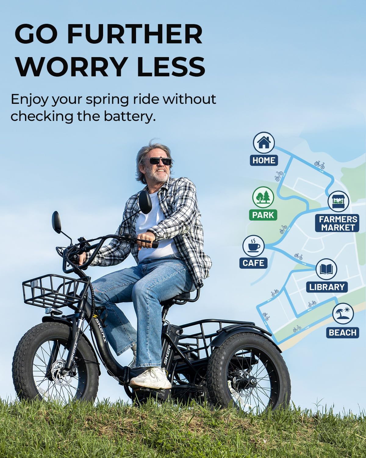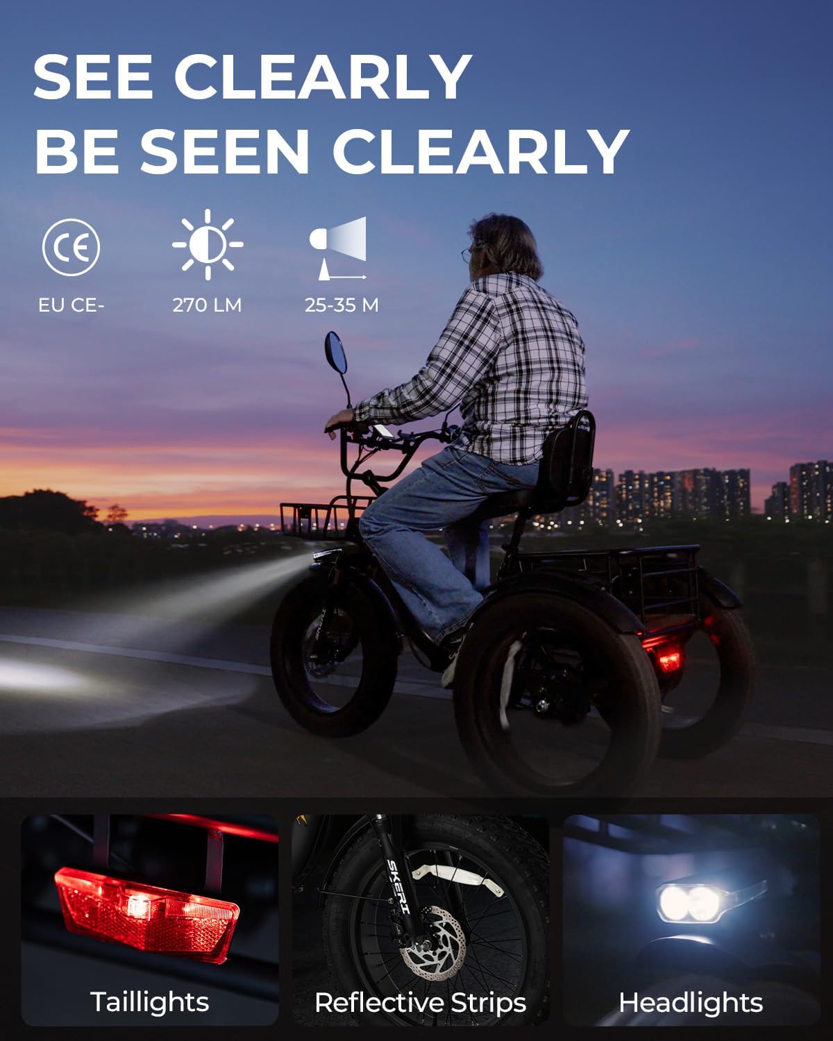 Skeri Electric Trike for Adults: Stability, Power & Freedom, Simplified Redefine your ride with the Skeri Electric Trike: The ultimate 3-wheel electric bike engineered for unwavering stability, robust power, and everyday freedom. Perfect for seniors, commuters, adventurers, or anyone seeking a secure, versatile electric trike for adults. Conquer city streets, rugged trails, or steep hills with confidence on this intelligently designed adult tricycle. Why Choose the Skeri E-Trike? Unstoppable Power & Support: Tackle 20% inclines and any terrain effortlessly with a powerful 750W rear hub motor (1350W peak!), housed in a durable aluminum frame. Experience true peace of mind with responsive 24/7 customer support, a 24-month warranty, and easy setup (90% pre-assembled). This etrike for adults is built for reliability and backed like no other. Go Farther, Ride Safer: Venture further with confidence thanks to the high-capacity, UL Certified 48V 13Ah removable battery, delivering an exceptional up to 80 miles per charge. This folding electric trike meets the highest safety standards for worry-free adventures wherever you roam. All-Terrain Confidence & All-Day Comfort: Master snow, sand, gravel, or bumpy roads on rugged 20"x4" fat tires. Enjoy unparalleled comfort with the adjustable wide saddle and supportive backrest, reducing strain on your back and hips. Tailor your journey with multiple riding modes and monitor everything on the intuitive LCD display. This adult 3 wheel bike is built for exploration without compromise. Smart Storage, Effortless Portability: Maximize urban living with the space-saving folding aluminum frame. Store it easily in apartments, car trunks, or garages in seconds. Ample cargo capacity is guaranteed with upgraded front and rear baskets plus a sturdy rear rack. This foldable tricycle blends utility with ultimate convenience for errands, shopping, or getaways. Corner Like Never Before: Advanced Stability: Experience superior maneuverability and confidence on turns with our innovative rear differential system, allowing each wheel to rotate independently. Combined with hydraulic disc brakes and a low center of gravity, this electric trike for adults ensures a stable, secure ride on varied terrain and inclines – ideal for seniors, riders seeking extra balance, or those carrying cargo. Built for Every Adventure: Lightweight yet incredibly sturdy, the Skeri electric tricycle features a supportive ergonomic design ready for all-day rides. Whether you're replacing car trips, exploring trails, running errands, or simply enjoying the outdoors, this foldable electric trike delivers eco-conscious freedom without sacrificing performance or practicality. Conquer Terrain. Command Comfort. Choose Skeri .