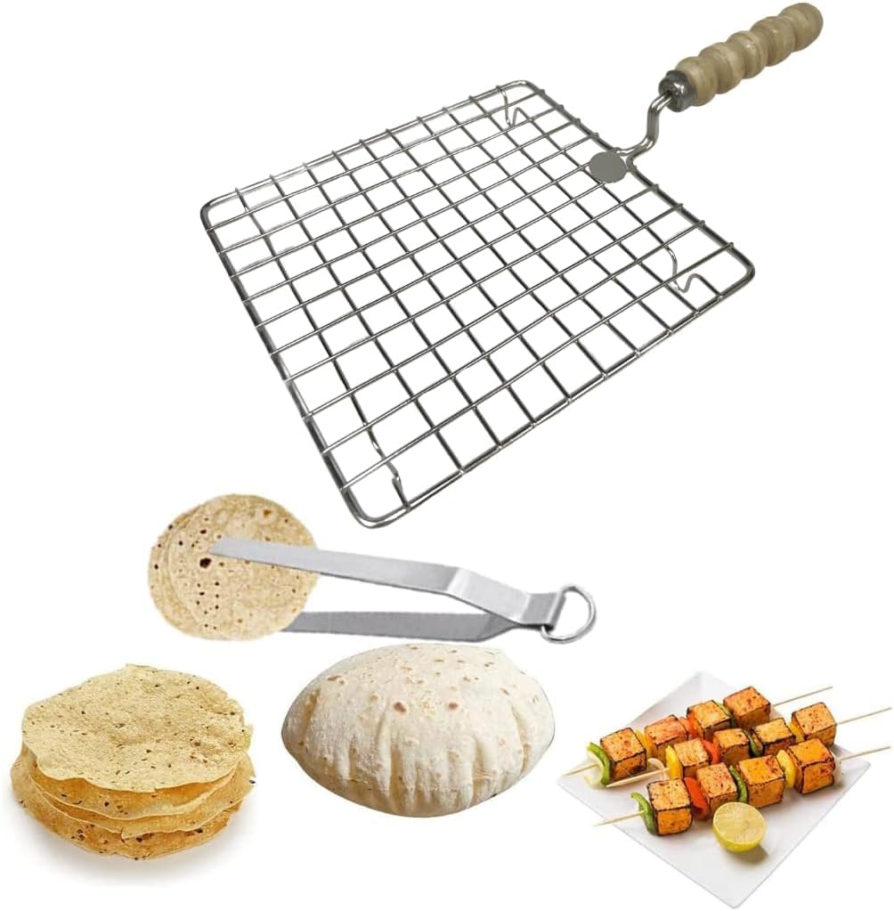Stainless Steel Round And Squae Roasting Net With Wooden Handle Wire Roaster Roti Grill Papad Grill Roti Roaster Kitchen Item- Pack Of 2Sale For- Pack Of 2Type- Rosting NetMaterial- Stainless Steel And WoodenColor- SilverABOUT THIS ITEM✥ Great and Easy to use product.✥ Made of stainless steel and wooden. Strong Sturdy handle that will not rise.✥ The Steel is made well to put on top of pans to cook.2.✥ Great for making Roti, chapatti, papad. Stainless Steel Wire Roaster - Use to Roast Papad, Roti, Chapati, Toast, Baigan Bharta, and more.