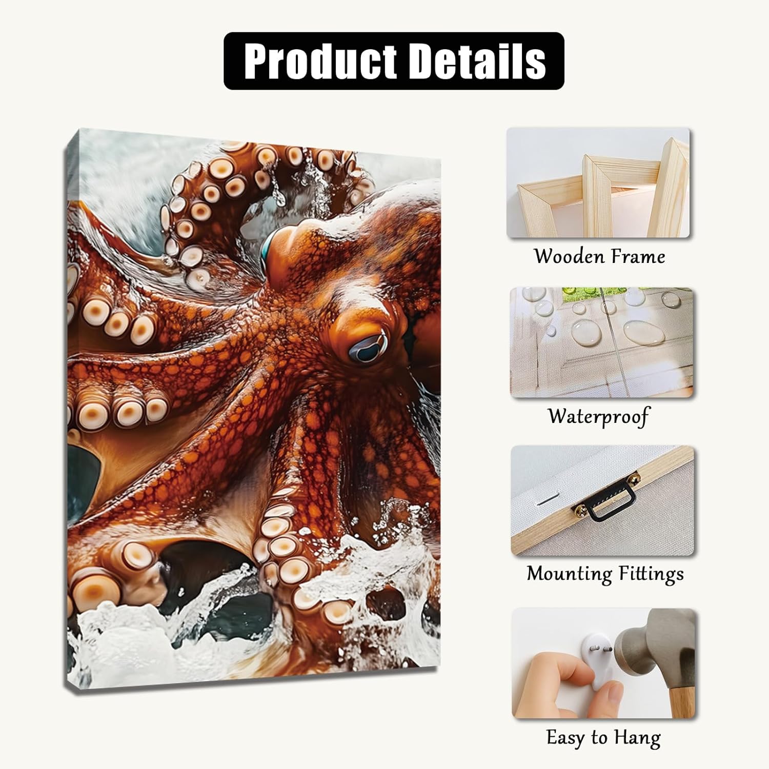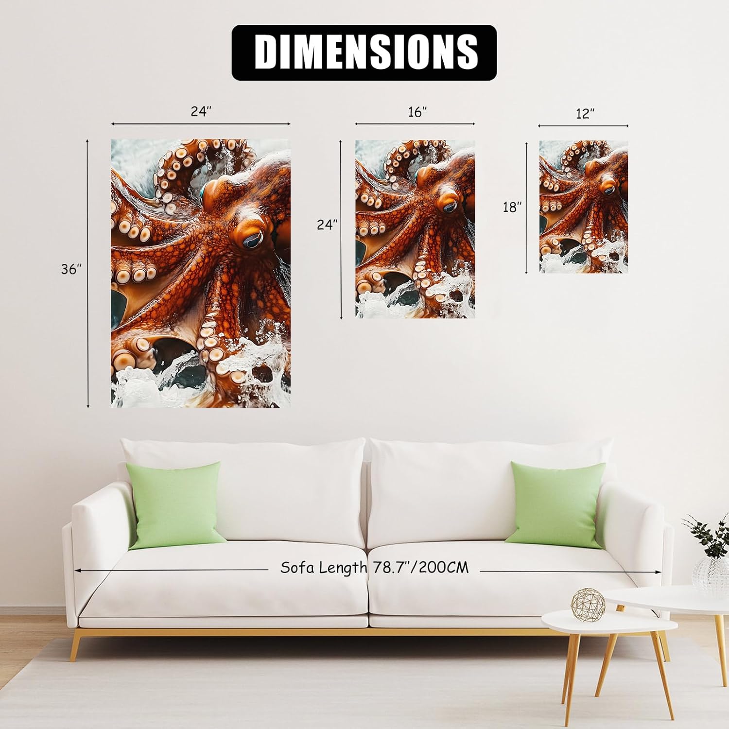 Giant Octopus Canvas Wall Art – 3 Panel Kraken Octopus Tentacle Print – Bold Nautical Decor for Bathroom, Living Room, or Coastal Spaces Product Features: Bring the mystery of the deep sea to your walls with this Giant Octopus Canvas Wall Art. Featuring a powerful kraken octopus in vivid detail, this 3 panel canvas print captures a dramatic underwater moment with swirling tentacles and ocean waves. Designed to make a bold statement, it’s a perfect match for nautical wall decor, ocean-themed bathrooms, or coastal living spaces that need an artistic focal point. The dynamic composition and life-like texture make it a standout piece in any room. Crafted for durability and effortless display. Printed on premium canvas using fade-resistant inks, each panel is built to last while retaining its rich color and detail. The panels are pre-stretched over sturdy wooden frames and come with pre-installed hardware for easy hanging. Whether you're decorating a beach house, office, or modern bathroom, this large octopus wall art offers both impact and sophistication to elevate your interior style. Available in multiple sizes to suit different spaces: (1)12x18 canvas wall art set of 3 (2)16x24 canvas wall art set of 3 (3)24x36 canvas wall art set of 3 Package includes: 1 × Giant Octopus Canvas Wall Art Set of 3 1 × Suspension accessory package Notes: 1. Please allow slight size variations due to manual measurement. 2. Colors may vary slightly due to different screen settings. 3. Before purchasing, please measure your wall dimensions to ensure the perfect fit. After-sales Service: We are dedicated to customer satisfaction, providing responsive and comprehensive after-sales support. If you have any concerns about your purchase, please contact us—we are always here to help and ensure your satisfaction.