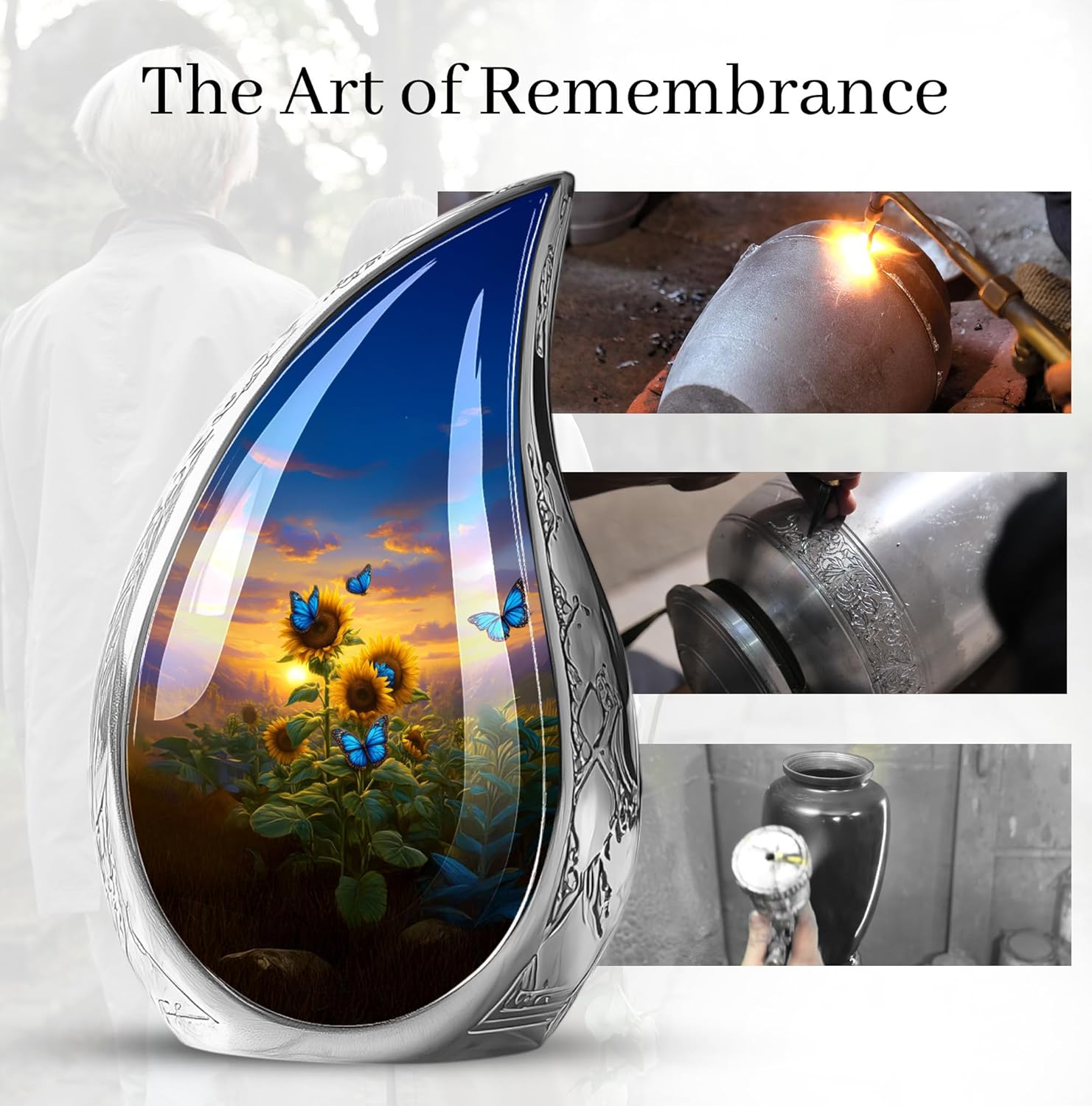 This sunflower-themed cremation urn for ashes adult is a graceful symbol of wisdom, peace, and eternal rest. Featuring a beautifully detailed sunflower design, it represents intelligence, protection, and spiritual guidance, making it a meaningful tribute to a loved one’s memory. The soothing color tones and artistic imagery blend seamlessly with home décor, offering both beauty and sentiment. This urn for ashes for mom and dad is crafted to hold ashes securely, with a threaded lid that ensures peace of mind over time. Ideal for men, women, or anyone who cherished nature and animals, this sunflower urn is a decorative yet respectful way to celebrate a life lived. Whether placed in a home decor, memorial setting, or given as a unique gift, this urns for human ashes adult man and woman honors the journey of the soul and care.